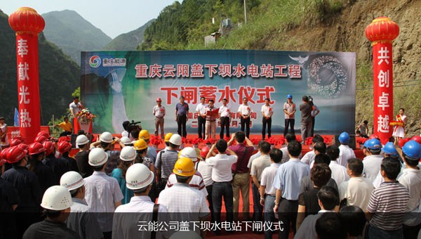 2012年8月10日,重慶云能投資興建的重慶市云陽縣蓋下壩水電站工程成功下閘蓄水。10時18分,隨著云陽縣委書記李洪義的一聲令下,巨型閘門穩(wěn)穩(wěn)落在導(dǎo)流洞進口閘槽底部后,下閘蓄水宣告圓滿成功。